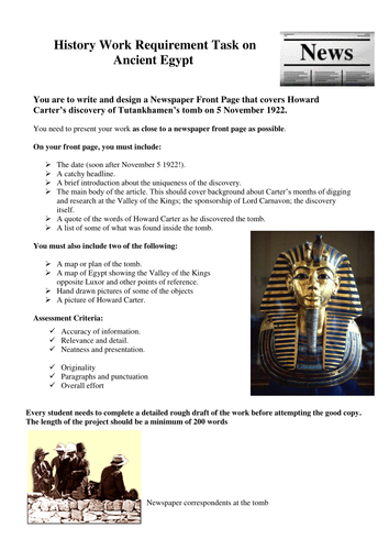 Howard Carter S Discovery Of King Tutankhamun S Tomb Newspaper Front Page Task Teaching Resources